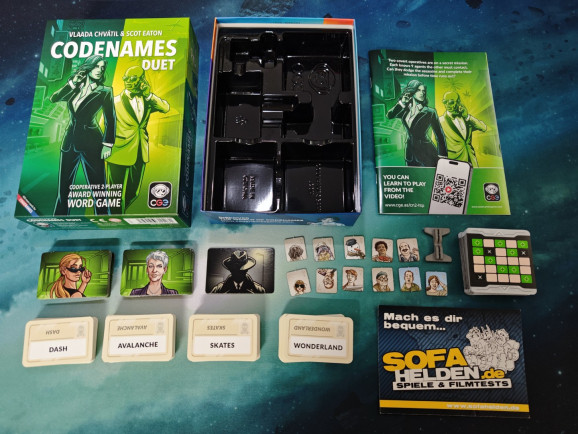 Die Gestaltung und Materialqualität von Codenames Duett entsprechen fast eins zu eins denen von Codenames. Der wesentliche Unterschied: statt der blauen und roten Agentenplättchen der beiden Teams teilen sich die Spieler in Codenames Duett 15 grüne Agentenplättchen. Auch der Materialumfang ist nahezu identisch zum Original: auch Codenames Duett kommt in der Neuauflage mit einem Plastik-Inlay; es gibt 200 Wortkarten mit insgesamt 400 verschiedenen Wörtern, die sich auch von denen in Codenames unterscheiden. Richtig gut: die Wortkarten in Codenames können auch in Codenames Duett und umgekehrt verwendet werden.