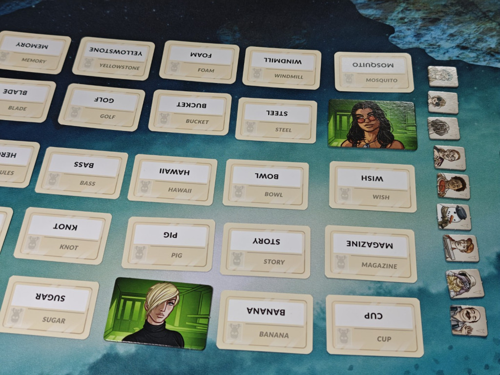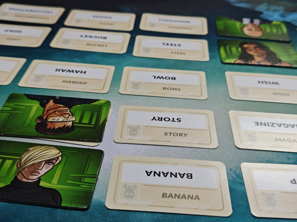 Ein wesentlicher Unterschied zu Codenames ist die Schlüsselkarte, die nun doppelseitig ist und mithilfe des Aufstellers in die Tischmitte gestellt wird. Die Teams müssen sich gegenübersetzen und dürfen nur ihre Seite der Schlüsselkarte sehen. Auf jeder Seite gibt es neun (grüne) Agenten, drei (schwarze) Assassinen und 13 (beige) unbeteiligte Wörter zu sehen, die unterschiedlich verteilt sind, sich aber alle auf dasselbe ausliegende 5 x 5 Wortraster beziehen.