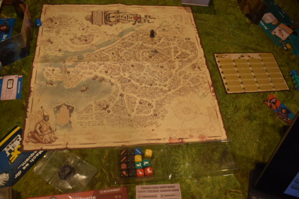 Fateforge - Die Chroniken von Kaan Deluxe Edition ist ein Storybasiertes Spiel, das in drei Akten gespielt wird. Jeder dieser Akte ist wiederum in mehrere Runden aufgeteilt. Für die Story- und Erkundungsrunden legt Ihr die Karte von Easafir in die Mitte und lauft mit Eurer Gruppenfigur darüber. Für die Kampfrunden benötigt Ihr die Geländeteile und baut daraus einen Spielplan, wie ihn die App vorgibt. Davon unabhängig müsst Ihr Euch zu Beginn des Spieles einen von fünf Charakteren aussuchen. Hierfür nehmt Ihr Euch das Tableau und die zugehörige, vorbereitete Box. Die Karte von Easafir legt Ihr in die Tischmitte und das übrige Spielmaterial erst einmal beiseite. In der App klickt Ihr Euch dann auch durch bis Ihr zu Naskês Brief kommt. Diesen lest Ihr laut vor und startet damit das Spiel…