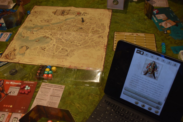 In Fateforge - Die Chroniken von Kaan gibt es zwei verschiedene Arten von Runden. Die, in denen Ihr die Welt erkundet und die Geschichte vorantreibt, und die Kampfrunden. In ersteren seid Ihr sehr viel in der App unterwegs, fällt Entscheidungen in Gesprächen, Laufwegen und lest viele Storytexte. Außerdem schaltet Ihr Orte auf der Legende frei, was Ihr durch das Abziehen der Aufkleber symbolisiert. Das alleine macht schon Spaß und hat einen Abenteuer-Charakter. Interessant ist hierbei auch der Medienbruch von der App auf die Karte und von dort auf die Story-Karten.