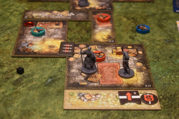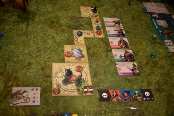 Zwischendurch werdet Ihr aber immer wieder Aggressionen gegenüberstehen und müsst kämpfen. Das geschieht in den Kampfrunden. Für diese gibt Euch die App einen Spielplan vor, den Ihr aus den Geländeteilen zusammensetzen müsst. Außerdem braucht Ihr dann Eure Charakterminiaturen, die Monsterscheiben und diverse Marker. So baut Ihr Euch, nach Dungeon-Crawler-Manier eine Kampfszene auf. Der Unterschied zu herkömmlichen Dungeoncrawlern ist aber, dass man sich hier häufig im Außenbereich bewegt und diese Szenen immer sehr stark in der Rundenzahl beschränkt sind.