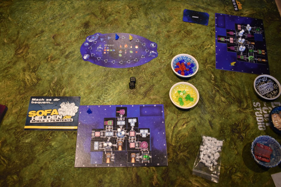 Nach der Bauphase folgt die Flugphase. Hierbei legt Ihr die Credits, Waren und Würfel bereit und den Spielplan in die Mitte. Dann nehmt Ihr Euch für jede Kabine zwei Astronauten, stellt sie darauf und verfahrt mit den Batterien ähnlich. Ihr nehmt Euch für jede aufgedruckte Batterie einen Energiemarker und legt Ihn auf das Plättchen.