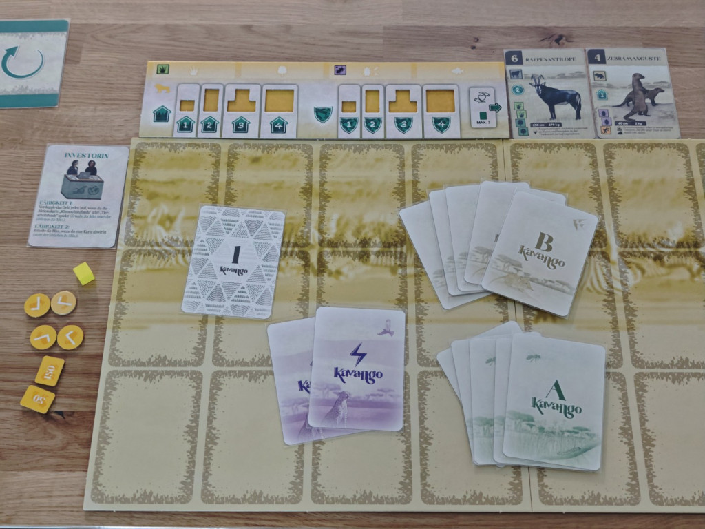 Neben den Karten, die gedraftet werden, gibt es noch drei weitere Kartendecks, die separat gemischt und als Nachziehstapel bereitgelegt werden müssen: die Forschungsaufgaben, aufgeteilt in drei Decks, eines für jede Runde (1-3). In die Tischmitte kommt der Spielplan. Er enthält neben der Siegpunkteleiste auch Platz für vier Karten mit Forschungsaufgaben. In der ersten Runde werden vier Forschungsaufgaben aus dem Kartendeck für Runde 1 offen ausgelegt. Der Spielplan zeigt auch eine Leiste für den Klimaschutz. Hier können alle Spieler im Spielverlauf Geldmarker platzieren, um die Klimaschutzstufe zu erhöhen, welche Voraussetzung für das Ausspielen bestimmter Tiere darstellen kann.