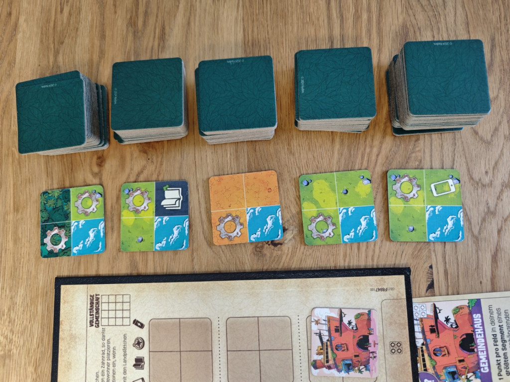 Dann gibt es noch so genannte Energiequellen unter den Landplättchen. Sollte es an allen vier Seiten an ein anderes Landplättchen orthogonal angrenzen, gibt es dafür acht Siegpunkte. Das ist ordentlich. Ein Nachteil ist allerdings, dass diese Energiequellen keinen Platz für Gebäude bieten und auch sonst keine weiteren positiven Effekte haben.