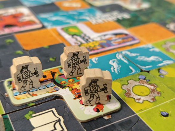 Außerdem wird man versuchen Zahnrad-Symbole auf identischen Terrains benachbart zueinander zu platzieren. Von Zahnrad-Symbolen hatten wir es noch nicht, weil sie an sich keine Siegpunkte geben. Aber nur auf Feldern mit Zahnrad-Symbolen können Gebäude-Plättchen gebaut werden; Und zwar auch nur dann, wenn sich alle Zahnrad-Symbole, die von einem Gebäude-Plättchen überbaut werden sollen, auf identischem Terrain, z.B. Wiese, befinden. Hier wird der Puzzle-Charakter von Leben in Reterra deutlich.