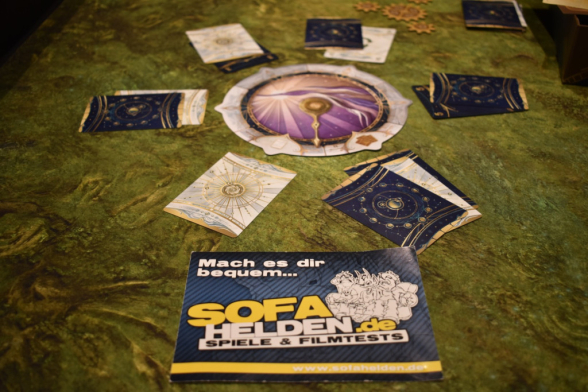 Das Spielmaterial zu Take Time ist relativ übersichtlich: Zwölf mysteriöse Umschläge mit schönem Uhr-Artwork, ein Stanzbogen und ein Papierumschlag mit Karten. Zu Beginn kann man zum Spielmaterial noch nicht so viel sagen. Die Marker des Stanzbogens sind eher schlicht, die Artworks der Uhrenumschläge wunderschön. Die Karten - eine Augenweide. Leider erkennt man es auf den Fotos nicht so richtig, sie sind alle auf den Rückseiten mit einem 3D-Effekt versehen. Ihr könnt die aufgedruckten Mondphasen und die Sonne also nicht nur durch die reflektierende Goldfarbe sehen, sondern auch ertasten. Dagegen wirken die Uhren schon fast trist. Sie sind vom Material her eher dünn, aber das ist ok. Dafür sind sie aber optisch sehr ansprechend.