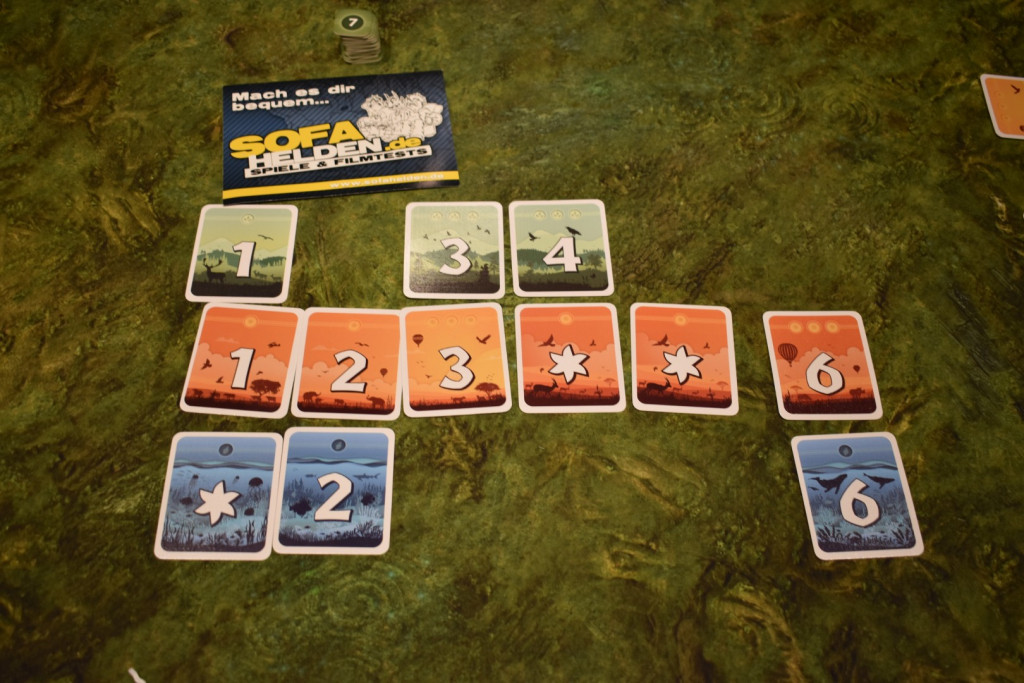 Die Krux an der Geschichte ist folgende: Ihr legt die Karten, sortiert nach Ihrer Farbe - beziehungsweise Landschaft - in Eurer Auslage aufsteigend aus. Dabei dürft Ihr jede Zahl pro Landschaft nur einmal haben, das heißt: doppelte Zahlen legt Ihr wieder ab. Außerdem möchtet Ihr, dass Ihr auf den Karten möglichst viele Punkte habt. Denn auf den Karten sind entweder drei oder ein Punkt abgebildet.