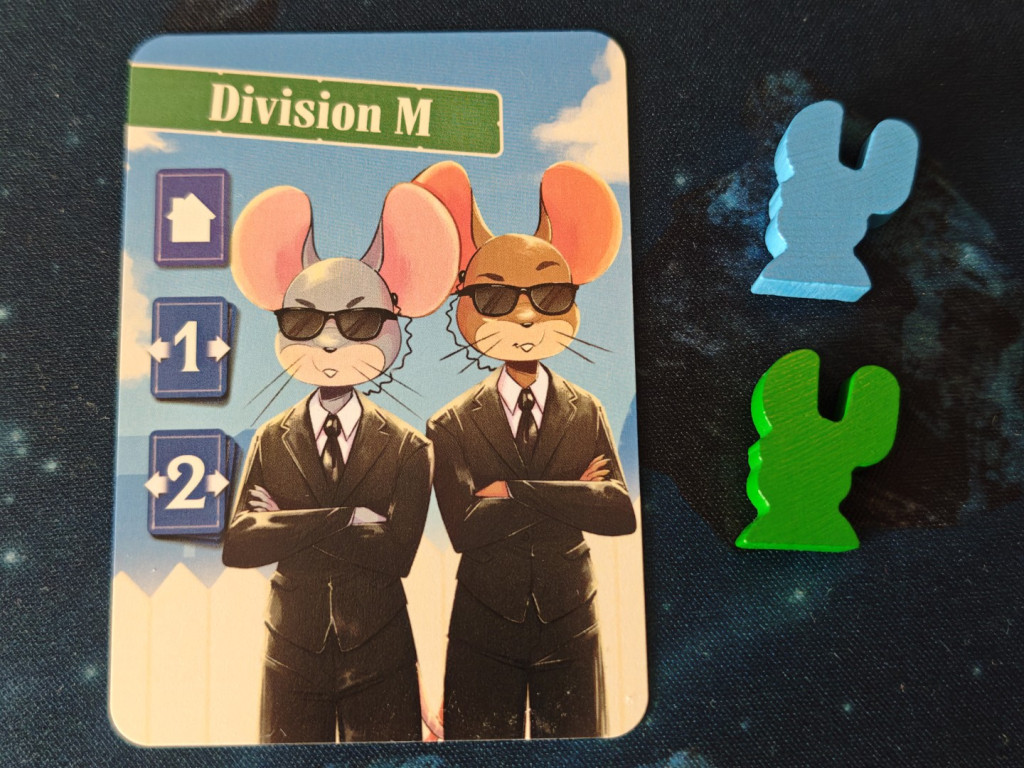 Was ist hier neu? Sobald man sich eine der neuen Agentenkarten mit der Division M nimmt, darf man seine Division M Spielfigur bewegen. Mit der ersten Karte platziert man seinen Division M Spielstein auf das eigene Startfeld des Spielplans. Mit der zweiten und dritten Division M Agentenkarte darf man diesen Spielstein um bis zu einem bzw. zwei Felder nach vorne oder hinten bewegen. Man kann also auch mit dieser Spielfigur den Gegner fangen. Anders als bei den Spielfiguren des Grundspiels, kann man aber an den gegnerischen Division M Spielsteinen vorbeilaufen, ohne dass dies irgendwelche Konsequenzen hätte. Nur, wenn man seine Bewegung direkt auf demselben Feld beendet, wäre das schlecht. Die Konsequenz: eine sofortige Niederlage.