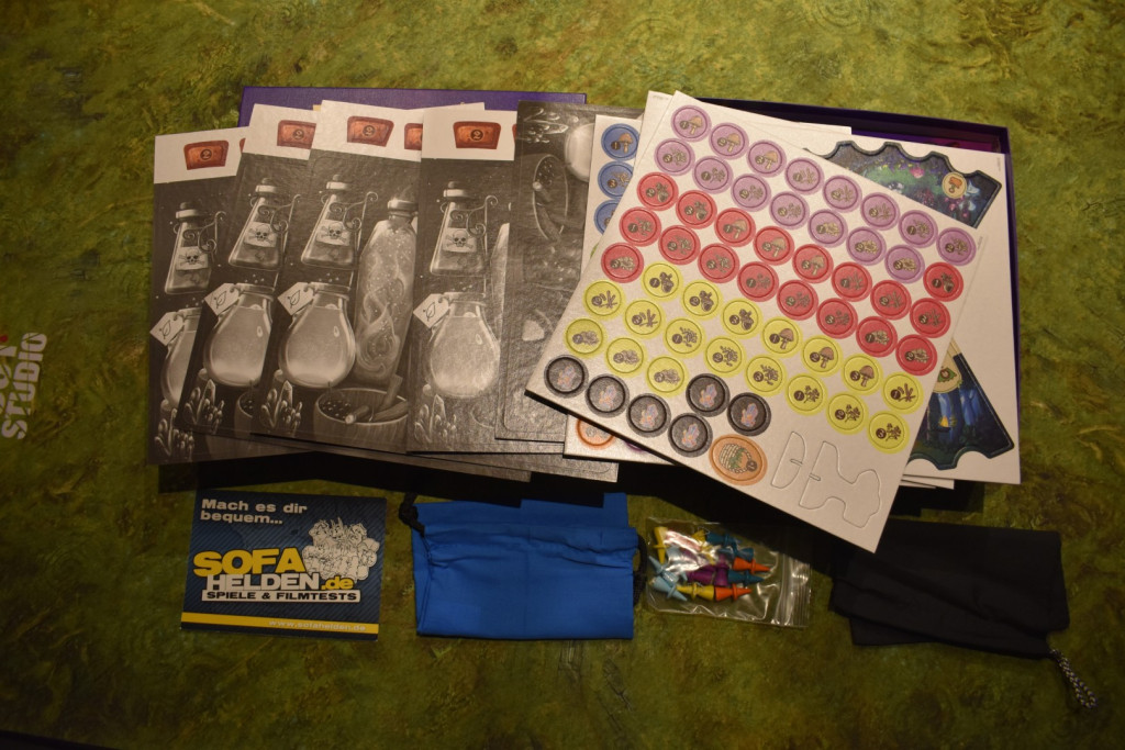Für den Spielaufbau nehmt Ihr Euch jeweils eine Brautafel. Außerdem wählt Ihr drei Lehrlinge einer Farbe. Die Plättchen mit den Zutaten packt Ihr in den Beutel, nehmt die sechs Waldstücke, mischt sie und legt sie als Kreis aus. Dabei wird ein Waldstück mehr aufgedeckt als Personen mitspielen und die übrigen werden verdeckt gelegt. In die Aussparungen der offenen Waldstücke legt Ihr nun je eine Zutat aus dem Beutel. Dann baut ihr den Wegweiser zusammen und stellt ihn auf das im Uhrzeigersinn erste, aufgedeckte Waldstück. Das Korbplättchen wird neben dem allgemeinen Vorrat an Korken in die Tischmitte gelegt. Nun erhält eine Person den Startmarker und es geht los.