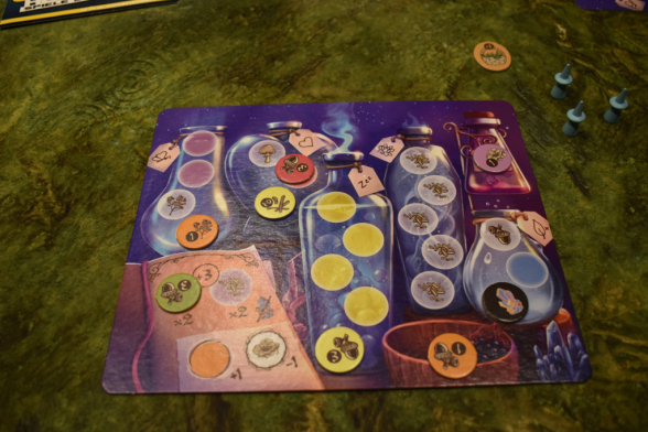 Nachdem Ihr alle Zutaten gesammelt habt und alle Lehrlinge wieder vor Euch stehen, fahrt Ihr mit dem Tränke brauen fort. Hierbei verteilt Ihr Eure gesammelten Zutaten beliebig auf Eurer Brautafel. Ihr müsst dabei aber darauf achten, dass die Felder Eurer Tränke die Farbe oder die Art der Zutat vorgeben. Außerdem, hat jede Brautafel eine eigene „verzaubert“ und „verflucht“ Farbe oder Sorte, die Euch Plus- oder Minuspunkte bringen. Zusätzlich habt Ihr je ein Feld für Spezialzutaten, die Euch ebenfalls Bonuspunkte bringen. Alle Zutaten, die Ihr nicht zuordnen könnt, müsst Ihr in die Giftflasche packen. Sie bringen Euch am Spielende Minuspunkte. Sobald Ihr einen Trank voll habt, erhaltet Ihr einen Korken. Seid Ihr (oder gleichzeitig andere Lehrlinge) die erste Person, die diesen Zaubertrank fertig hat, erhaltet Ihr den Korken mit fünf Punkten. Hat das jemand in einer anderen Runde vor Euch geschafft, erhaltet Ihr nur zwei Punkte. Sobald eine Person den vierten Trank verkorkt, spielt Ihr die aktuelle Runde noch zu Ende und beendet dann das Spiel mit der Endwertung: