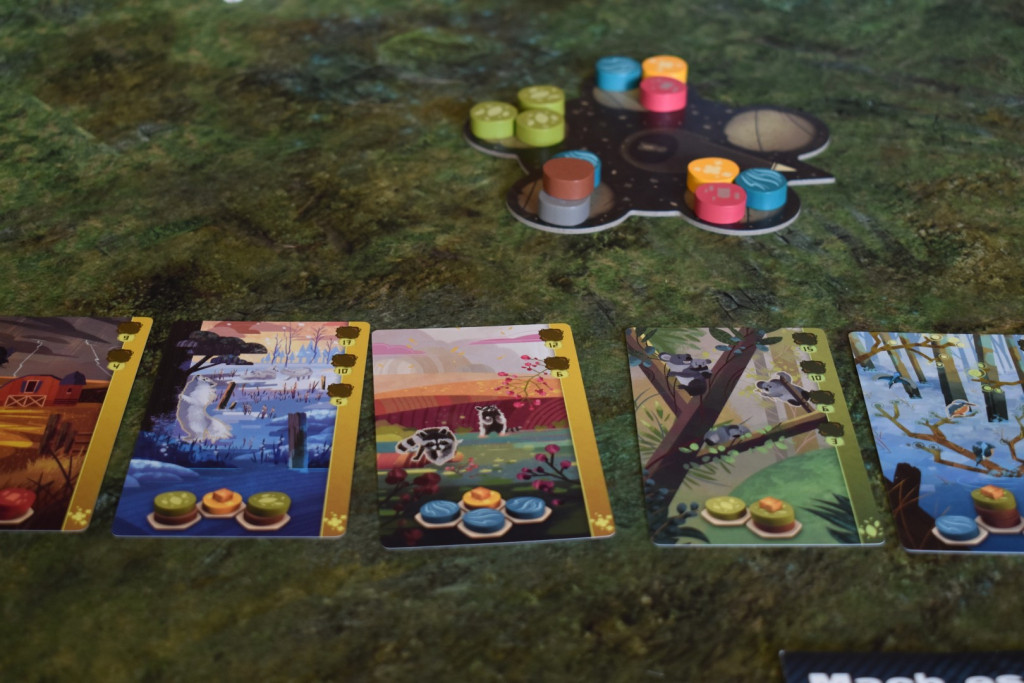 Als erstes legt Ihr alle Spielsteine in den Beutel. Den Spielplan legt Ihr in die Mitte und auf jedes Feld drei zufällig gezogene Spielsteine. Die Tierkarten mischt Ihr und legt fünf als offene Auslage aus, die Tierwürfel kommen als Vorrat daneben. Nun nehmt Ihr Euch je ein Tableau und eine Karte mit der Wertungsübersicht. Der Pfeil des Spielplans markiert die Person, die zuletzt eine atemberaubende Landschaft gesehen hat und damit das Spiel beginnen darf.