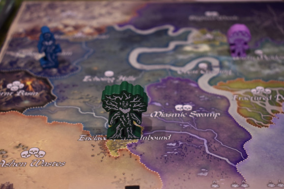 In der Reisephase habt Ihr die Wahl, die Karte zu bereisen. Dabei müsst Ihr darauf achten, dass die Felder, die Ihr betretet, der Schädelzahl entsprechen, die Ihr auf der Erfahrungsleiste bereits erreicht habt. Zu Beginn könnt Ihr also nur die Gebiete bereisen, die nur einen Schädel haben. Laufen könnt Ihr auf angrenzende Gebiete bis zu drei Felder. Dabei müsst Ihr bei zwei eine und bei drei zwei Wunden erleiden. Dies soll die Strapazen einer längeren Reise darstellen. Als Sonderregel gibt es noch den Fluss in der Mitte. Er kann ausschließlich über die Brücke in „Great Crossing“, dem Schiff auf dem Meer oder ganz im Norden in Frostbite Peak überquert werden.