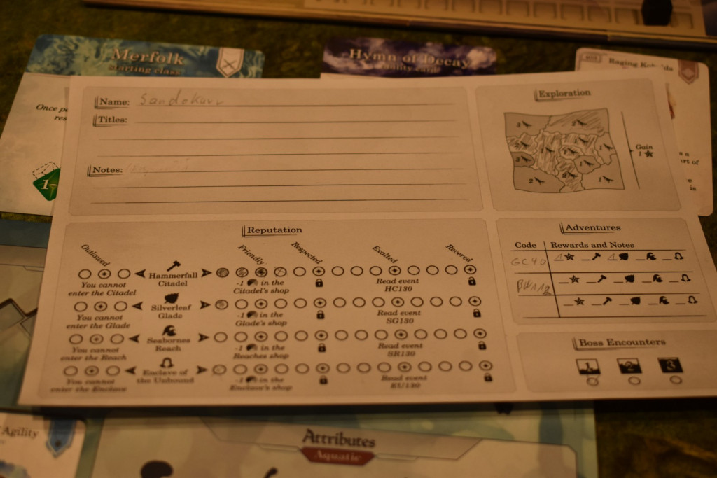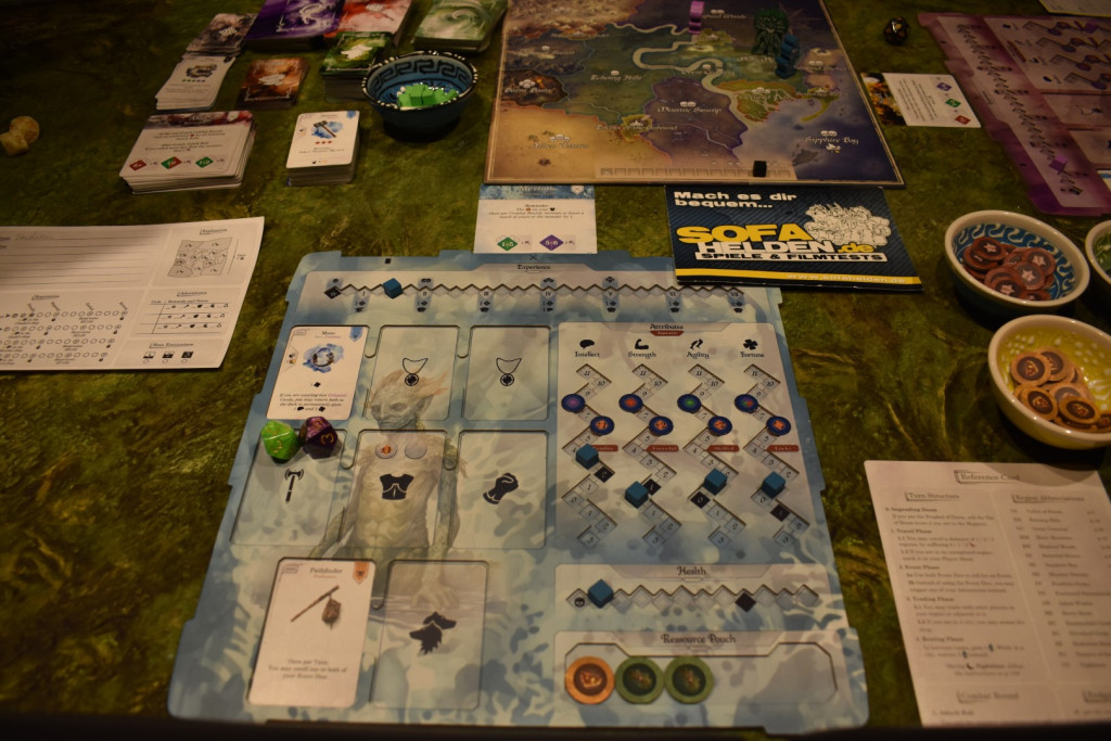 Für den eigentlichen Spielaufbau verteilt Ihr als erstes zufällig die vier Klassen untereinander. Alle bekommen am Ende ein Tableau mit einer Startfertigkeit, das Säckchen mit dem dazugehörigen Spielmaterial, einen Charakterbogen sowie eine Übersichts“karte“ (sehr übersichtlich, aber schon fast ein Tableau). Auf Eurem Tableau legt Ihr die Würfel auf die schwarz markierten Flächen bei der Erfahrung, den Attributen und den Lebenspunkten. Die runden Plättchen legt Ihr auf die entsprechenden Aussparungen der Attributleisten. Eure Startfertigkeit legt Ihr in die obere, mittlere Aussparung Eures Tableaus. Überlegt Euch einen Namen für Euren Charakter und schreibt Ihn auf Euren Bogen. Außerdem müsst Ihr nun noch zwei Eurer Attribute um je einen Punkt erhöhen und eines um einen senken. Dann legt Ihr den Spielplan in die Mitte und sortiert die Karten nach den Zahlen, am besten denen auf der Rückseite. Ob aufsteigend oder absteigend ist erst einmal egal, es geht nur darum, dass Ihr die Karten später gut wiederfindet. Anhand der Kartenrückseiten bildet Ihr nun Stapel. Die Karten mit dem Amboss auf der Rückseite und die Fertigkeitenstapel mischt Ihr jeden für sich und legt sie neben die anderen Stapel. Die Marker legt Ihr auch als Vorrat bereit. Nun zieht Ihr einen zufälligen Boss mit der Zahl eins oder nehmt die in der Anleitung vorgegebene „Mysteriöse Frau“. Die weiseste Person von Euch erhält den schwarzen Untergangswürfel und notiert den Titel „Untergangsprophet*in“ auf Ihrem Charakterbogen. Diese Person darf nun damit starten, Ihre Figur auf eine beliebige Stadt zu setzen. Alle anderen machen das ebenfalls im Uhrzeigersinn. Dabei dürft Ihr Euch immer nur auf eine freie Stadt setzen. Ihr erhaltet die dort abgebildete Ressource und dürft ein Rufkästchen auf Eurem Charakterbogen zu dieser Stadt markieren. Dann legt Ihr noch einen schwarzen Würfel auf die Untergangsleiste und die Prophet*in des Untergangs beginnt das Spiel.