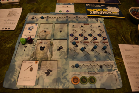 Wir sind im Bereich Pen & Paper absolut unerfahren und würden daher Restless als eine Art Einstiegsspiel in dieser Richtung bezeichnen. Ein Abenteuer besteht aus drei Episoden, die jeweils in einen Bosskampf münden. Dabei versucht Ihr möglichst viel Erfahrung zu sammeln, Eure Fertigkeiten und Ausrüstung zu verbessern und die Karte zu erkunden. Wie lange die Episoden dauern hängt sehr stark von den Mitspielenden ab, aber auch etwas vom Würfelglück, denn wann der Boss erscheint, entscheidet die Untergangsleiste. Wie schnell Ihr darauf vorlauft, entscheidet wiederum der Untergangswürfel. Bei uns dauerten die Episoden zwischen drei und dreieinhalb Stunden. Es ist aber auch möglich/vorgesehen, das Spiel jederzeit zu unterbrechen und zu „speichern“. Hierfür ist die Rückseite der Charakterbögen entsprechend auszufüllen.