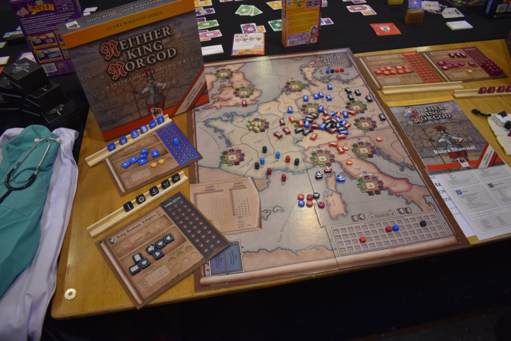 Am Sonntag hatten wir, da wir mit der Bahn angereist waren, unsere Koffer dabei. Daher begaben wir uns wieder zum Eingang Ost, da hier die Kofferabgabe war. Darauf verzichteten wir aber am Ende, da sich unsere Koffer sehr gut schieben ließen und der Sonntag von allen Tagen der leerste war. Wir spielten Druids of Edora und sonst nichts. Wir waren den ganzen Tag in den Hallen unterwegs, sprachen mit Verlagen und ließen uns Neuheiten zeigen. Am Ende tat ich mich sehr schwer, die Messe zu verlassen, irgendwie hatte ich das Gefühl „hab ich einen Verlag vergessen?“, „Habe ich ein Spiel übersehen?“, „irgendwas war doch da noch?“. Doch irgendwann musste ich dann aufgeben und wir verließen die Messe Richtung Hauptbahnhof, um die kommenden fünf Stunden bis zur Abfahrt unseres Zuges irgendwie tot zu schlagen…