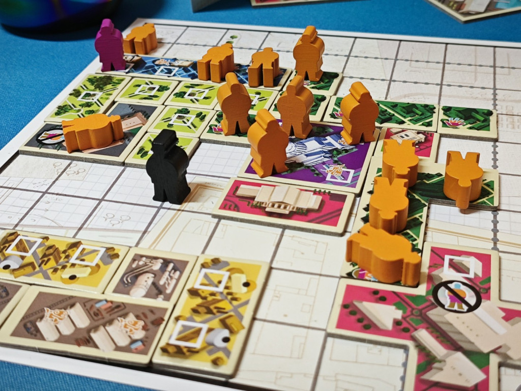 Neben den Stadtratsplan wird der allgemeine Vorrat an Gebäudeplättchen gebildet. Die meisten Gebäude sind nicht limitiert, so z.B. Wohnsiedlungen (dunkelgrün), Fabriken (gelb), Gewerbe (blau) und Parks (hellgrün). Öffentliche Gebäude (rot) und Spezialgebäude wie Polizeistation und Feuerwache sind allerdings limitiert; ihre Anzahl ist abhängig von der Spielerzahl. Nicht jeder Spieler wird jedes dieser Gebäude bauen können, sodass hier Konkurrenz und ein kleines Wettrennen entsteht. Die meisten Gebäudeplättchen gibt es in verschiedenen Formen und Größen. Der Bau hat auch unterschiedliche Voraussetzungen, was Anzahl und Größe benachbarter Gebäude und/oder Ressourcen betrifft. Außerdem gibt es den Effekt des automatischen Wachstums der Gebäudeplättchen. Stadtplanung ist damit ein großes Puzzle und bedarf viel Vorausplanung. Wozu das Ganze? Die Gebäude liefern Arbeitereinsatzfelder für die Bürger, um diese zu aktivieren und Ressourcen, Siegpunkte und andere Spieleffekte zu generieren.