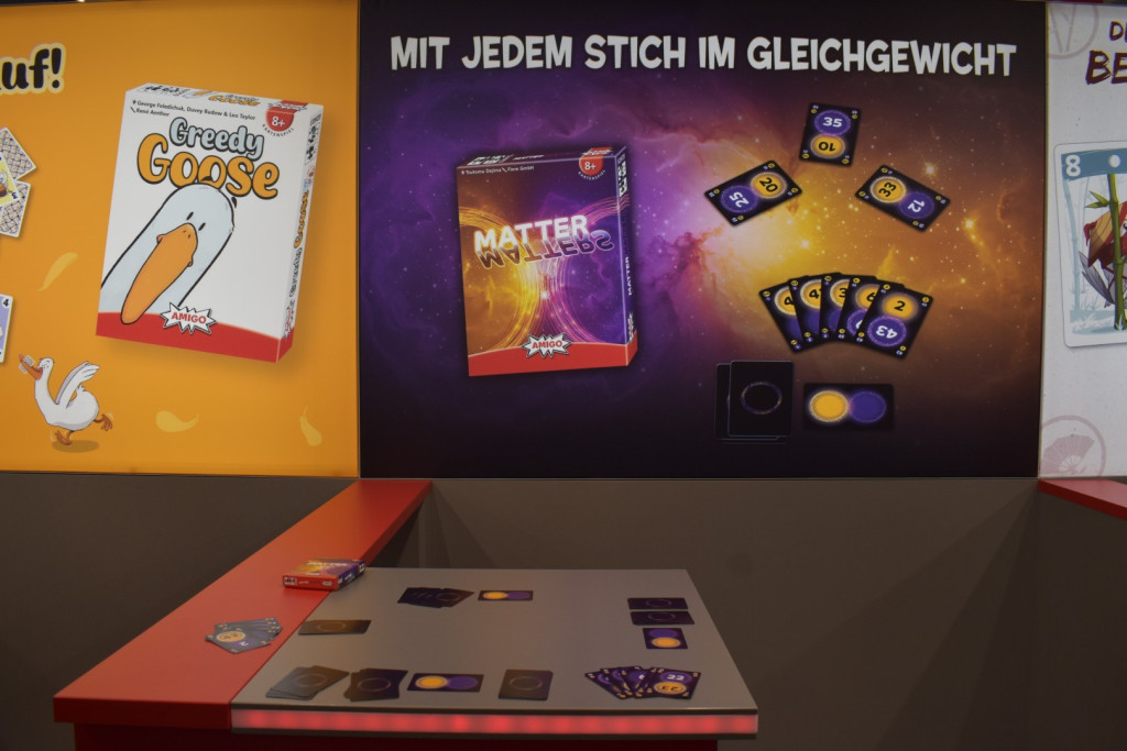 Wie mittlerweile üblich reisten wir erst am zweiten Messetag, dem Mittwoch, an. Dies war besonders in Bezug auf das Wetter eine gute Wahl, denn die Tage zuvor herrschte ein ziemliches Schneechaos. Am Mittwoch konnten wir hiervon nur noch die Überbleibsel bewundern. Kaum angekommen und kurz in der Presselounge gesammelt, ging es auch schon zu den ersten Terminen. Hier stand Amigo als erstes auf dem Programm. Zwar kannten wir die Neuheiten im Großen und Ganzen schon, aber die Führung hat uns doch noch einiges Neues offenbart. So gibt es von Clack! nun eine magnetfreie Variante und wir konnten die ersehnte Jubiläumsausgabe von Wizard bewundern. Diese enthält nun alle Sonderkarten bisheriger Editionen (außer von Das schwarze Auge) und darüber hinaus noch ein paar weitere Verbesserungen. Es gibt keinen Wertungsblock mehr, sondern alles wird über Marker gezählt. Ebenfalls zu den Frühjahrsneuheiten gehört das Anfänger-Stichspiel Matter Matters, das mit einem interessanten Spielprinzip ums Eck kommt, bei dem man jede Stichfarbe hat und bei seinen Stichen auf das Gleichgewicht aus Materie und Antimaterie achten muss. Etwas mehr überzeugte uns Greedy Goose. Ein Spiel, bei dem es um das Sammeln von Karten geht, aber man darf nicht zu gierig sein. Den Abschluss machte dann Koffer, Katze & Sombrero, hinter dem wir erst eine Variante von „ich packe meinen Koffer“ vermutet hatten. Es ist aber ein weiteres Set-Collection-Spiel.