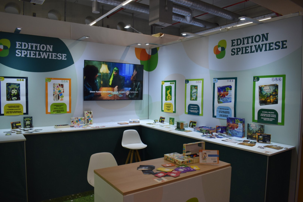Ebenfalls am Amigo-Stand befand sich der Verlag Peasoup, der zwei „Spielbücher“ herausbringt, die uns gerade mit einem Kind in der Grundschule besonders gelockt haben. In einer Kombination aus klassischem Abenteuerbuch, einer App und Karten sind wir hier sehr gespannt, wie das Spiel bei Kindern ankommt. Dann ging es weiter zu Hutter, die sich nun auch mit um den Vertrieb des „Spiel Das!“-Verlags kümmern. Hier gab es interessante Ausblicke auf Jiangnan, Workerplacement in China, das kooperative Bergsteiger-Spiel The Peak Team und ein paar interessante Logik-Spiele. Von „Spiel Das!“ stach uns vor allem das uns bereits bekannte Aqualuma und Aelos ins Auge. Aber auch Raising Robots und die Vielfalt an Würfel- und 2-Spieler-Spielen weckten unsere Aufmerksamkeit.