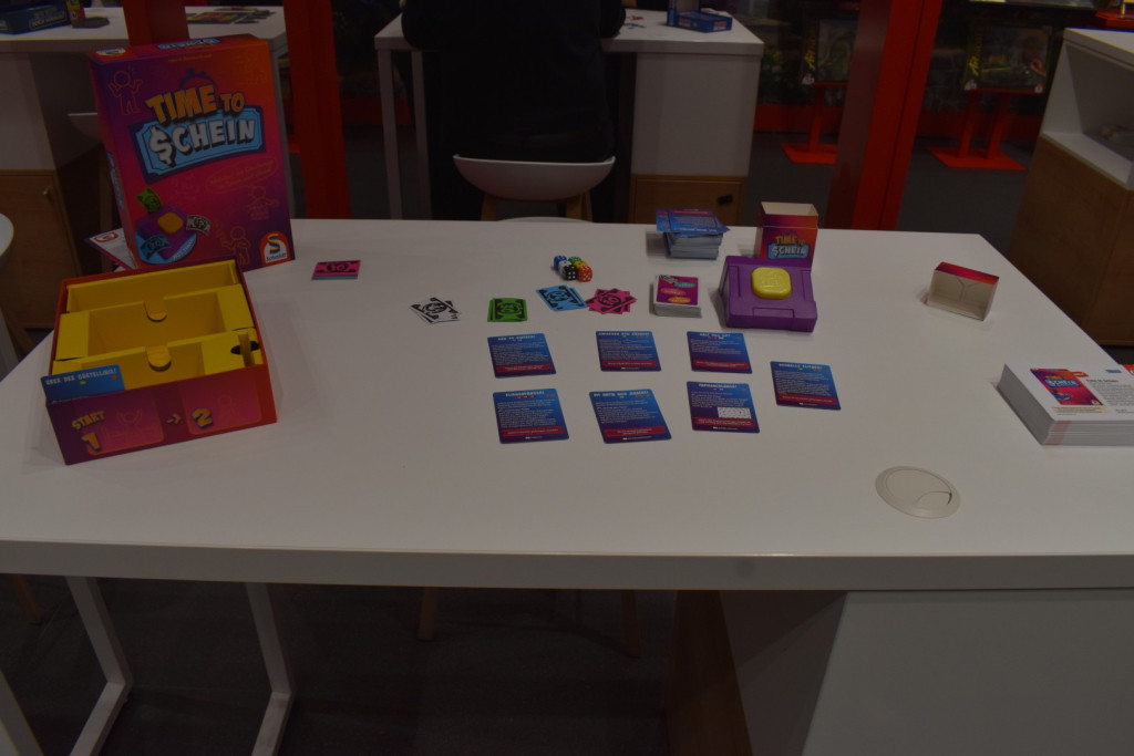 Bevor es dann mit Schmidt Spiele weiterging, hatten wir etwas Zeit über die Messe zu schlendern und machten einen kurzen Stopp bei Pendragon. Hier gab es die von uns mit Sehnsucht erwarteten Spiele Eternaut und No more Dead - New York zu sehen. Allerdings wird es noch einiges an Zeit dauern, bis sie auf den Markt kommen. Bei Schmidt Spiele gab es wieder viel Interessantes im Bereich der Familienspiele zu entdecken. Für uns das Highlight war das Partyspiel Time to Schein, bei dem Geldscheine als Währung für die Zeit eingesetzt werden und von einem Buzzer eingelesen werden können. Innerhalb einer gewissen Zeit muss man nun Aufgaben erfüllen, um sein Geld zu vermehren und es erneut setzen zu können.