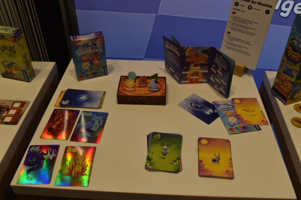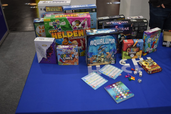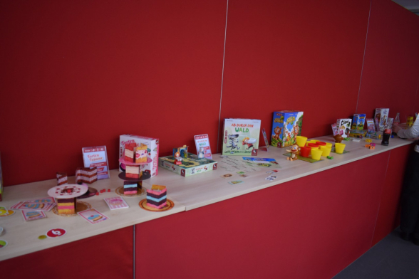 Den Abschluss der Messe machte für uns dann Game Factory. Hier gab es neben der Kollektion aus Minispielen wie beispielsweise Auf die Eier, noch einige familientaugliche Spiele zu entdecken. Da mir Spiele mit Memory-Komponente nicht so liegen, blieb bei mir vor allem das interessante Legespiel chroma und das Partyspiel Dito! hängen. chroma erinnert ein wenig an Domino. Man muss Farbkarten so auslegen, dass die angrenzenden Karten mit den passenden Farben auf dem Farbkreis übereinstimmen. Hinzu kommen dann noch einige Sonderkarten. Bei Dito! geht es darum, Begriffe zu finden und auf einem 3x3 Tableau einzutragen. Diese sollten nur mit einer und nicht mehr Personen übereinstimmen, um möglichst viele Punkte zu erhalten.