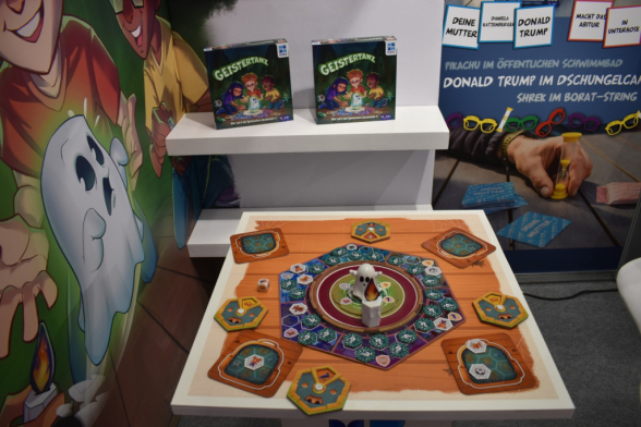 Den Abschluss des Tages machte Kosmos. Hier gab es ordentlich auf die Ohren, denn man bringt hier nun auch ein Musikspiel im Hitster-Stil heraus. Play macht aber ein paar Sachen anders. So kann man sich vorab pro Team für unterschiedliche Genres zum Raten entscheiden und man hat unterschiedliche Spielmodi, wie beispielsweise „früher“ und „später“, die sich aber auch auf die Erscheinungsjahre der Titel beziehen. Dafür ist man allerdings nicht auf Spotifiy eingeschränkt, sondern kann auch andere Anbieter wie beispielsweise Apple Music verwenden. Darüber hinaus gab es einige Kartenspiele zu entdecken, von denen uns besonders die Neuauflage von Catan - Das Kartenspiel nahegelegt wurde. Hier sind wir schon sehr gespannt. Es macht einiges anders und einfacher. Besonders interessant wirkte der Aufbau von Temple Twist, einem kooperativen Labyrinth-Spiel, das dieses Jahr sogar den Toy Award gewinnen konnte. Mit Kosmos und schweren Füßen endete dann auch unser erster Messetag etwas früher. Schließlich wussten wir, dass der Donnerstag mit der Red Night etwas länger werden würde.