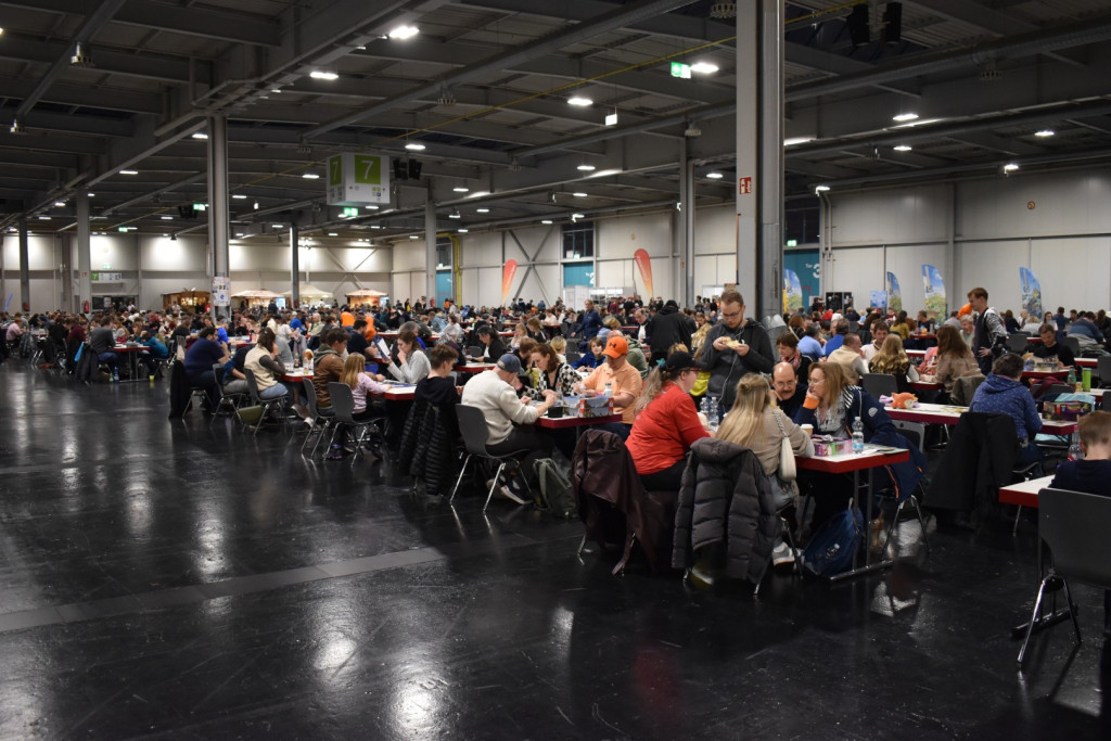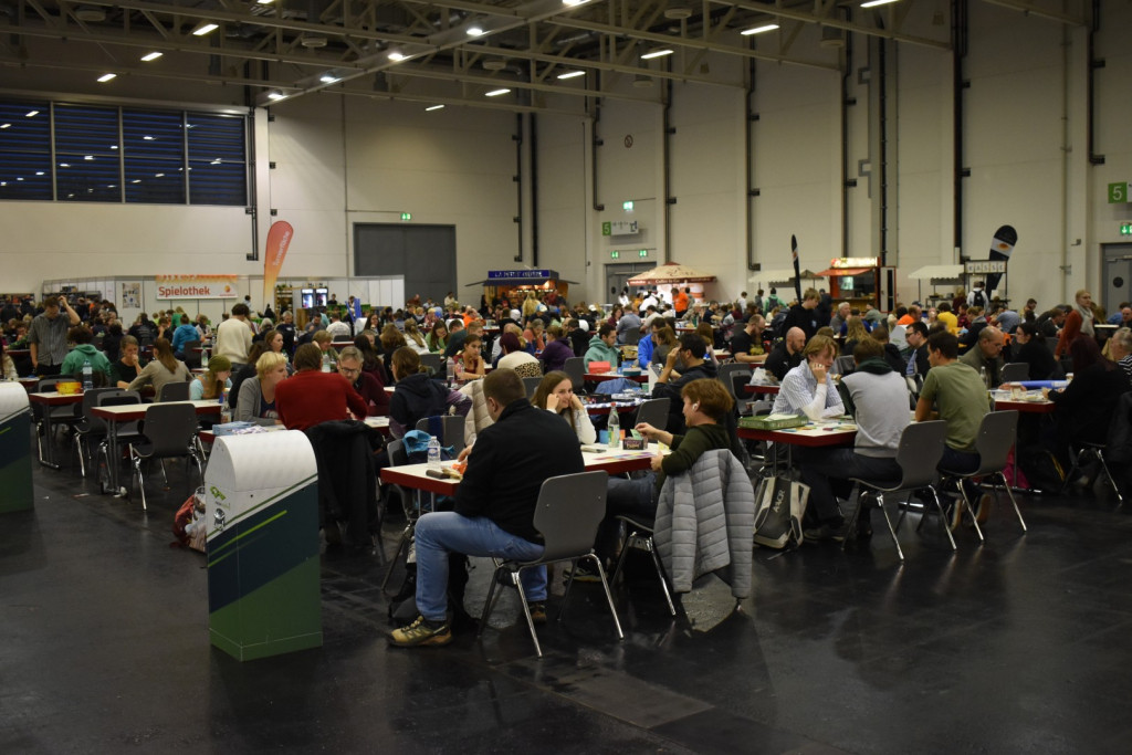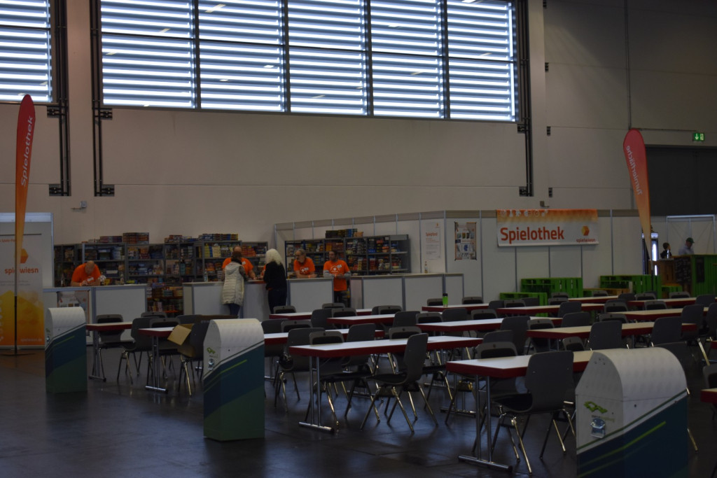 Tag 2 bedeutete nicht nur für uns mehr Personen, mit denen wir spielen „mussten“, sondern auch mehr Besucher für die Spielwiesn. Man merkte schon direkt beim Einlass: heute ist deutlich mehr los. Anders als am ersten Tag entschied sich die Security auch dazu, die Tickets der Besucher*innen schon einzuscannen und alle vor den Hallen zu sammeln, bevor die Türen zu ebendiesen geöffnet werden. Nachdem die Messe offiziell eröffnet war, mischten auch wir uns unters Volk und schlossen als erstes unsere Bildungslücke bezüglich des originalen 7 Wonders. Anschließend versuchten wir uns an Van Helsing und tauchten ab mit The Crew: Mission Tiefsee. Dann standen wir etwas auf dem Schlauch, was wir spielen sollten. Also drehten wir eine Runde durch die Halle 5, um vielleicht einen Verlagstisch zu ergattern, aber: keine Chance. Somit blieb noch eine Hoffnung: ein größeres Spiel auf der Exklusiv-Fläche zu spielen. Und siehe da: hier konnten wir noch einen letzten Tisch ergattern und das Spiel Thebai anspielen. Letztes Jahr gab es diese Fläche auch schon, doch wir hatten sie noch nicht genutzt. Dieses Jahr war sie größer und wir hatten das Gefühl, dass man hier gut Chancen hat, einen Platz zu ergattern und zu spielen. In unseren Augen eine sehr gute Lösung für die teureren Spiele. Hier waren auch einige Erklärer*innen unterwegs, sodass sich die meist komplexeren Spiele nicht erst durch die Regelstudie in die Länge zogen. Auch dieses Jahr wurden etwa gegen Mittag weitere Spielflächen eröffnet. Dieses Mal wurde Halle 4 hinzugefügt und mit Tischen und Bänken ausgestattet.