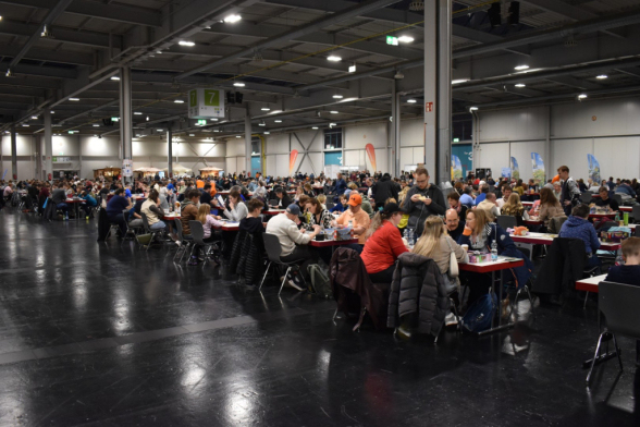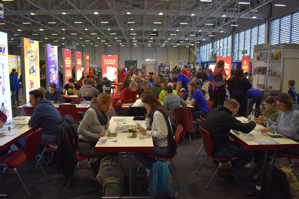 Dieses Jahr waren wir bewusst noch etwas früher als sonst auf der Messe. Nicht nur, weil wir es durch die Ferien mit den Kindern konnten, sondern auch, weil wir Großes vorhatten. Eine kleine Idee war etwas eskaliert und endete in mehr Planung als erwartet. Damit war unser erster Weg nach der Anmeldung erst einmal der Kosmos-Stand zur Abstimmung bezüglich unseres Catan Connect Events. Dieses Jahr in Halle 5, denn die Ausstellerhalle wurde mit der Halle der Spielfläche getauscht. Noch wirkte alles sehr ruhig. Die Aussteller*innen bereiteten Ihre Stände vor, die Erklärer*innen die Spielothek und auch an anderer Stelle bereitete man sich auf die Besuchenden vor.