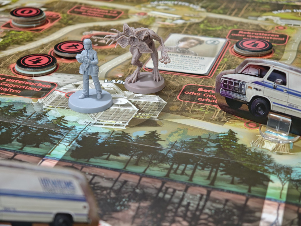 Auf mit Zahlen gekennzeichnete Levelfelder werden Stapel mit der angegebenen Anzahl Levelplättchen platziert. Dann wird immer das oberste Plättchen aufgedeckt, sodass man zu Spielbeginn etwas mehr Informationen zur Verfügung hat. Sieben Levelplättchen werden mit fünf Demogorgon-Plättchen gemischt und dann drei Stapel zu je vier Plättchen neben drei Orte platziert, an denen man die Aktion „Will retten“ ausführen kann. Demogorgon-Plättchen fungieren als variable Zahl für den Stapelwert, die durch die Anzahl an Stapeln im Demogorgon-Bereich bestimmt wird (von 0 bis 8 und zu Spielbeginn 4). Wird der Demogorgon bekämpft, kann man ihn schwächen und so Stapel aus diesem Bereich entfernen, um die „Will retten“-Aktion zu erleichtern. Apropos Demogorgon: Die Demogorgon-Miniatur kommt zu Spielbeginn auf die Schule in der Schattenwelt. Neben dem Demogorgon machen euch auch die Streifen das Leben schwer. Jeweils eine Streife wird auf die Orte Burg Byers in Hawkins und das Labor in der Schattenwelt platziert.