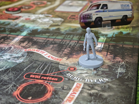In Staffel 1 gibt es fünf Aktionen mit Probe. In der Schule und im Haus der Byers kann man „Rekrutieren“. Bei Erfolg darf man sich die entsprechende Verbündeten-Karte nehmen, die fortan durch ihre Sonderfähigkeit deine Erfolgschancen massiv erhöhen wird. Hoffentlich. Das Labor in Hawkins kann man „untersuchen“, um in Zukunft immer ein zusätzliches Ausrufungszeichen auf Aktionskarten ignorieren zu können – Ausrufungszeichen sind schlecht und erhöhen die Anzahl zu ziehender Ereigniskarten am Zugende. Eine besonders wichtige Aktion, die strategisch clever eingesetzt werden sollte, ist „Elfi helfen“. Gelingt die Probe, darf man eine in der aktuellen Partie noch nicht genutzte Kraft von Elfi triggern. Dabei stehen im Labor in der Schattenwelt und im Haus der Wheelers jeweils drei verschiedene Kräfte zur Verfügung, deren Verwendung spielentscheidend sein kann. Elfi wäre nicht Elfi, wenn sie sich nicht revanchieren würde. Dann wäre noch die Aktion, auf die man während der gesamten Partie hinarbeitet: „Will retten“. Diese gibt es an drei verschiedenen Orten. Erst wenn die entsprechende Probe an allen drei Orten gelungen ist, gewinnt man die Partie.