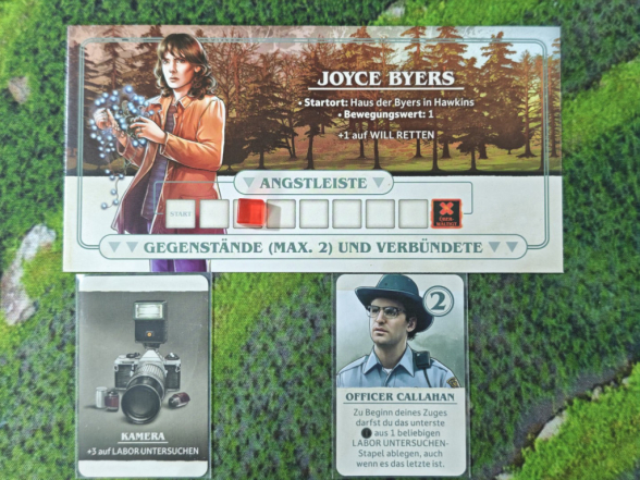 Zuletzt wählen die Spieler jeweils einen Charakter. Man hat die Wahl zwischen den Kids Lucas Sinclair, Mike Wheeler, Dustin Henderson und Nancy Wheeler sowie den Erwachsenen der Serie Jim Hopper und Joyce Byers mit jeweils einzigartigen Sonderfähigkeiten. Hat man sich entschieden, nimmt man sich die Miniatur und das Tableau des entsprechenden Charakters. Auf das Tableau wird ein Angstmarker auf das Startfeld der Angstleiste platziert. Das sind quasi die „Lebenspunkte“, denn erreicht der Angstmarker das letzte Feld, ist ein Charakter hinüber. Die Miniatur wird auf den Spielplan gestellt: Jeder Charakter startet auf einem anderen Ort des Spielplans, wie auf dem Charaktertableau angegeben. Zuletzt wird die Elfi-Miniatur auf das erste Feld der Ereignisleiste des Spielplans platziert. Sie hat nur drei Felder.