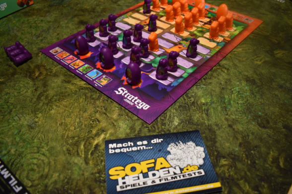 Für den Spielaufbau stellt Ihr den Spielplan zwischen Euch, sodass alle auf jeweils einer farbigen Seite sitzen. Die Dinofiguren der entsprechenden Farbe nehmt Ihr Euch und stellt sie so auf, dass sie für Euch, aber nicht für das Gegenüber sichtbar sind. Anschließend verteilt Ihr noch eure drei Eier - auch so, dass nur Ihr sie sehen könnt - auf den drei Vulkanfeldern. Je nach Spielvariante (Stratego Quest!, nicht aber Stratego Triumph!) benötigt Ihr dann noch den Würfel. Bei Stratego Quest! dürfen die violetten, bei Stratego Triumph! die orangenen Dinos das Spiel beginnen.