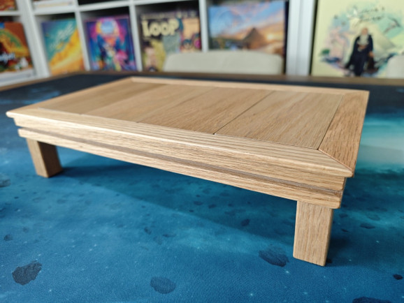 Die Verarbeitung des Tisches ist super, wir sind wirklich überrascht. Gerade in so einem kleinen Format Holz so passgenau zu bearbeiten, kann nicht einfach gewesen sein. Es handelt sich ja auch nicht um einen simplen Tisch. Vier herausnehmbare Tischplatten liegen passgenau auf einer inneren Leiste auf, die selbst auch eine Einkerbung hat. Der Tisch hat zudem auch außen eine Einkerbung zum Einhängen von Zubehör. Und tatsächlich lassen sich die vier Tischplatten umdrehen und dort einhängen, wo sie als Trays für z.B. Tokens oder Münzen fungieren können. Nun sind wir schon bei den Funktionen.