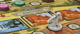 Sobald Ihr an der Reihe seid, spielt Ihr in der Bewegungsphase eine Eurer Handkarten. Jede Karte zeigt Euch an, wie viele Eurer Figuren Ihr bewegen dürft und wie weit Ihr mit jeder dieser Figuren laufen dürft. Bewegen dürft Ihr Euch jeweils auf orthogonal angrenzende Felder, außer bei einer Sonderkarte, die Euch explizit anweist, diagonal zu laufen. Außerdem gibt es noch eine Karte, bei der Ihr gegnerische Figuren bewegen müsst. Darüber hinaus gibt es noch Karten für den Kampf, für das Bewegen sowie Auslösen des Eliminators. Die Karten werden im Prinzip von oben nach unten ausgeführt. Als erstes lauft Ihr. Dabei kann es passieren, dass Ihr am Ende auf einem Feld landet, auf dem schon fünf Figuren stehen. Ist das der Fall, schubst Ihr eine Figur Eurer Wahl auf das nächste benachbarte Feld in Eurer Bewegungsrichtung. Ist dort ein Loch, so fällt sie runter und Ihr erhaltet die Figur als Beute. Wenn Ihr den Eliminator bewegt, dürft Ihr ihn in eine beliebige Richtung (orthogonal oder diagonal) an ein angrenzendes Feld bewegen (kein Loch und nicht die Mitte). Löst Ihr ihn aus, drückt Ihr den Knopf. So fliegt ein Plättchen mit Figuren nach oben. Nun müsst Ihr gucken, wo die darauf befindlichen Figuren gelandet sind. Alle Figuren, die runtergefallen sind, werden in die Schachtel gelegt, alle Figuren, die auf einem Feld gelandet sind, werden dort wieder aufgestellt. Wenn Eure Karten die überkreuzten Schwerter zeigen, beginnt der Kampf. Hierbei prüft Ihr alle Felder einzeln auf Mehrheiten. Diese Farbe darf eine beliebige der anderen Figuren ausschalten und die Figur als Beute nehmen.