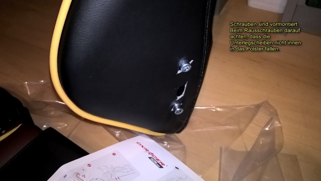 Nachdem die Schrauben also entfernt wurden, die Sitzfläche ausgepackt wurde und die Lehne nun in die Halterungen des Sitzes gesteckt wurden, wird die Lehne entsprechend mit den Schrauben und dem Inbusschlüssel festgezogen. Die Halterungen und auch die Schrauben sind recht stabil, sodass man keine Angst haben muss, bei etwas zu viel Kraft gleich was zu beschädigen (Bild 9). Anschließend werden die aus Plastik bestehenden schwarzen Abdeckungen montiert. Zugleich verdecken diese dann auch wie die vorher auf dem Bild ersichtlichen Aussparungen. Auch bei den Abdeckungen hat DXRacer mitgedacht und die beiden Halterungen so unterschiedlich gemacht, dass auch jemand mit zwei linken Händen schnell erkennt, welche wohin gehört.
