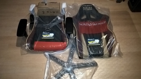 Als Nächstes stand das Auspacken auf dem Programm. Bereits auf dem Karton wird von dem Einsatz von Langschwertern und Macheten zum Öffnen der Verpackung (Bild 1) abgeraten. Nachdem man also vorsichtig das Klebeband entfernt hat und den Karton öffnet, wird auch klar warum. Ganz oben ist natürlich die Rückenlehne des Sitzes zu sehen. DXRacer denkt hier jedoch mit und schützt den Sitz noch mit einer zusätzlichen recht stabilen Schaumstoffmatte (Bild 2). Nachdem man diese umgeklappt hat, findet man dort auch gleich die bereits erwähnte Rückenlehne (Bild 3) vor, die man recht bequem und ohne Probleme rausheben kann. Darunter befindet sich das aus stabilen Aluminium bestehende Drehkreuz des Sitzes (Bild 4). Nun noch die Sitzfläche (Bild 5), die beiden Polster und einen kleineren Karton und schon kann der Karton beiseitegelegt werden.