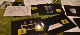 Nun aber los, den Dungeon vorbereiten. Die Wahl des Tisches ist bei keinem Spiel so wichtig wie in Dungeon Fighter. Ein Tisch mit kürzeren Beinen, z.B. ein Couch Tisch, der aber dennoch breit genug ist, scheint hier eine gute Wahl zu sein. Am Ende ist es aber vermutlich Geschmackssache und von den eigenen Wurffähigkeiten abhängig. Zum Punkt: die Zielscheibe wird aus den vier Spielbrettteilen zusammengebaut und auf den Tisch platziert; nicht unbedingt in die Tischmitte, denn jeder muss die Zielscheibe auch mit seinen Würfelwürfen treffen können. Wir haben eine Wurfposition festgelegt und sind immer abwechselnd aufgestanden. Dementsprechend haben wir die Zielscheibe auf einer Seite des Tisches ideal positioniert. Spoiler: es hat nicht geholfen. Anyways, was sieht man auf der Zielscheibe? Von außen nach innen steigen die Werte, das ist typisch für Zielscheiben; diese hier hat Werte von 1 bis 5, das Bullseye ist eine 10. Daneben gibt es noch vier kleinere runde Bereiche etwa auf halber Distanz zwischen Rand und Mitte der Zielscheibe mit dem Wert 6. Und dazwischen Löcher. Da will der Würfel nicht landen.