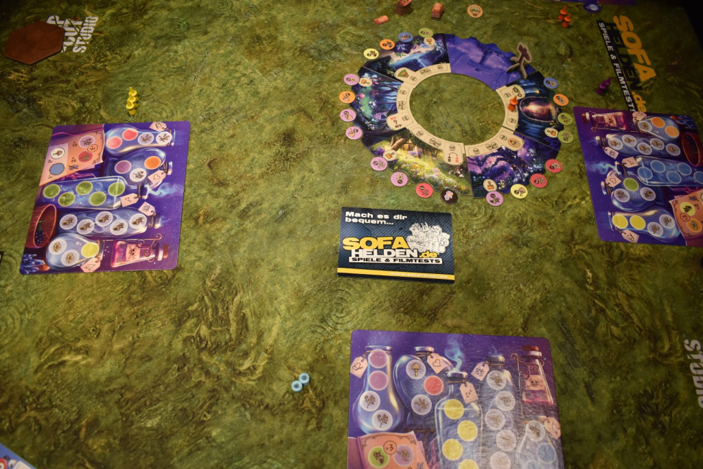 Für den Spielaufbau nehmt Ihr Euch jeweils eine Brautafel. Außerdem wählt Ihr drei Lehrlinge einer Farbe. Die Plättchen mit den Zutaten packt Ihr in den Beutel, nehmt die sechs Waldstücke, mischt sie und legt sie als Kreis aus. Dabei wird ein Waldstück mehr aufgedeckt als Personen mitspielen und die übrigen werden verdeckt gelegt. In die Aussparungen der offenen Waldstücke legt Ihr nun je eine Zutat aus dem Beutel. Dann baut ihr den Wegweiser zusammen und stellt ihn auf das im Uhrzeigersinn erste, aufgedeckte Waldstück. Das Korbplättchen wird neben dem allgemeinen Vorrat an Korken in die Tischmitte gelegt. Nun erhält eine Person den Startmarker und es geht los.