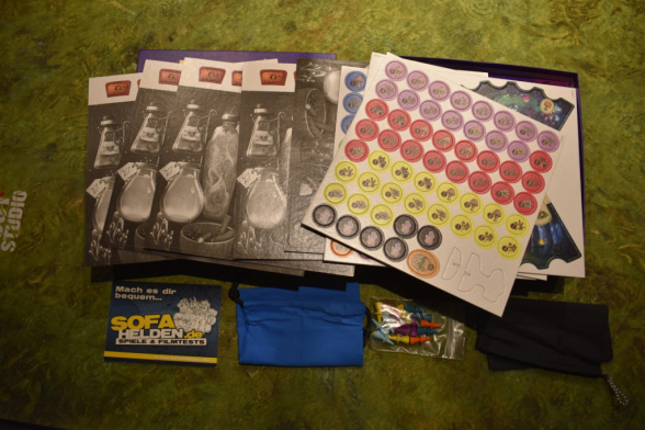 Das Spielmaterial wirkt erst einmal sehr umweltverträglich. Ein Großteil ist aus Karton, die Figuren sind aus Holz und bis auf den Zipp-Beutel für die Holzfiguren ist kein Kunststoff zu finden. Insgesamt ist alles sehr übersichtlich und einfach gestaltet, was zur Zielgruppe - Familienspiel ab zehn - sehr gut passt. Nichtsdestotrotz ist das Design sehr ansprechend und stimmig. Auch die Figuren sind sehr süß. Neben dem bereits erwähnten Material befinden sich in den Stanzbögen diverse Marker, die Brautafeln, Korken und der modulare, runde Spielplan. Außerdem gibt es noch zwei Stoffbeutel zur Aufbewahrung.