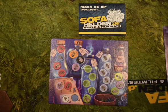 Nachdem Ihr alle Zutaten gesammelt habt und alle Lehrlinge wieder vor Euch stehen, fahrt Ihr mit dem Tränke brauen fort. Hierbei verteilt Ihr Eure gesammelten Zutaten beliebig auf Eurer Brautafel. Ihr müsst dabei aber darauf achten, dass die Felder Eurer Tränke die Farbe oder die Art der Zutat vorgeben. Außerdem, hat jede Brautafel eine eigene „verzaubert“ und „verflucht“ Farbe oder Sorte, die Euch Plus- oder Minuspunkte bringen. Zusätzlich habt Ihr je ein Feld für Spezialzutaten, die Euch ebenfalls Bonuspunkte bringen. Alle Zutaten, die Ihr nicht zuordnen könnt, müsst Ihr in die Giftflasche packen. Sie bringen Euch am Spielende Minuspunkte. Sobald Ihr einen Trank voll habt, erhaltet Ihr einen Korken. Seid Ihr (oder gleichzeitig andere Lehrlinge) die erste Person, die diesen Zaubertrank fertig hat, erhaltet Ihr den Korken mit fünf Punkten. Hat das jemand in einer anderen Runde vor Euch geschafft, erhaltet Ihr nur zwei Punkte. Sobald eine Person den vierten Trank verkorkt, spielt Ihr die aktuelle Runde noch zu Ende und beendet dann das Spiel mit der Endwertung: