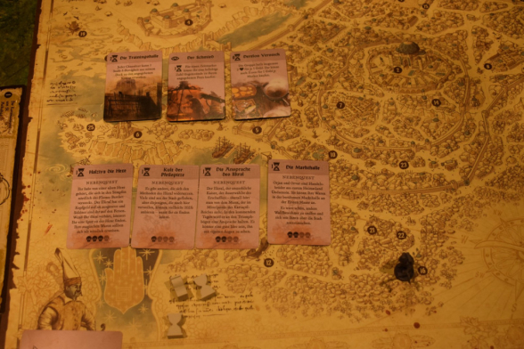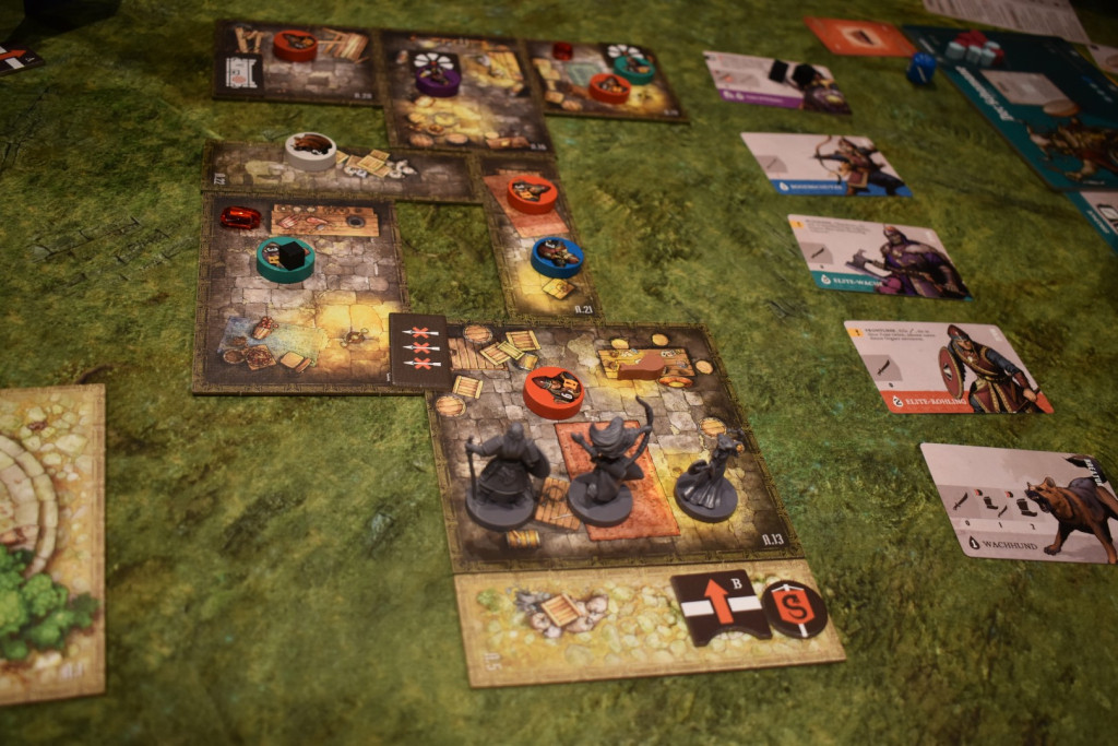 Zwischendurch werdet Ihr aber immer wieder Aggressionen gegenüberstehen und müsst kämpfen. Das geschieht in den Kampfrunden. Für diese gibt Euch die App einen Spielplan vor, den Ihr aus den Geländeteilen zusammensetzen müsst. Außerdem braucht Ihr dann Eure Charakterminiaturen, die Monsterscheiben und diverse Marker. So baut Ihr Euch, nach Dungeon-Crawler-Manier eine Kampfszene auf. Der Unterschied zu herkömmlichen Dungeoncrawlern ist aber, dass man sich hier häufig im Außenbereich bewegt und diese Szenen immer sehr stark in der Rundenzahl beschränkt sind.