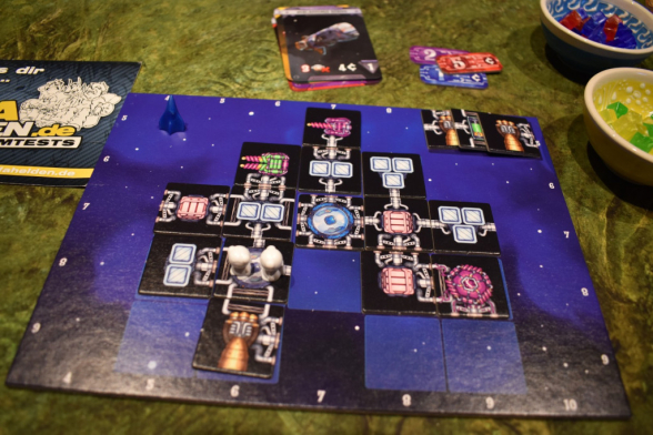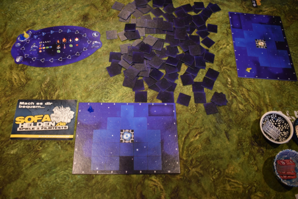 Für die erste Phase des Spieles legt Ihr die Raumschiffbauteile verdeckt in die Mitte. Parallel dazu sich alle je einen Schiffsplan und die zwei Raketenminiaturen in der gewünschten Farbe. Hinzu kommt noch eine zentrale Wohneinheit, die Ihr auf das Feld in der Mitte Eures Schiffsplanes legt. Dann kann es auch schon losgehen.