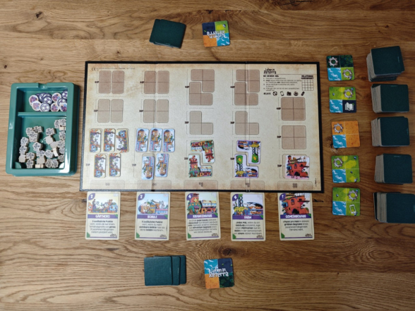 Das vierte Tray mit den Bewohnern und Müll- sowie Relikt-Markern sollte in Reichweite platziert werden. Diese Komponenten bilden einen allgemeinen Vorrat und können ebenfalls auf Landschaftsplättchen platziert werden. Nun kann es schon losgehen.