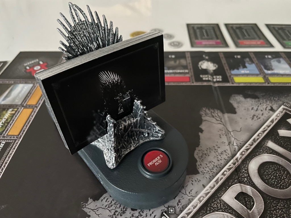 Das Spiel ist dasselbe wie die meisten anderen Monopoly-Varianten, alles aber natürlich im Stil vom Game of Thrones. Hier hat sich allerdings viel verändert, denn die sechs Spielfiguren sind neu, das Spielbrett zeigt interessante Orte aus der Serie und auch der Ort der Ereigniskarten ist perfekt gewählt, denn sie werden im Eisernen Thron platziert. Nicht nur dass dieser sehr cool aussieht, nein er hat auch noch einen roten Knopf, der nach dem Drücken die Titelmelodie spielt – GENIAL! Während der Song durch das Zimmer schallt, können die Silber- und Goldmünzen aus dem Karton gedrückt und für die Spieler ausgeteilt werden. Jeder nimmt sich dann noch eine Spielfigur und es kann LOSgehen.