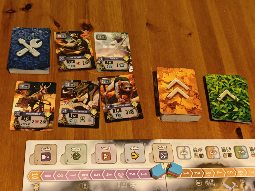 Die dritte Aktion „einen Spezialisten anheuern“ ist simpel. Man nimmt sich die gewünschte Spezialisten-Karte aus der Auslage, zahlt die oben links angegebenen Kosten, immer Nahrung, und spielt sie direkt in seine Auslage. Spezialisten-Karten geben oft gut Siegpunkte und erlauben es als Aktion Batterien gegen andere Ressourcen zu tauschen, je nach Karte. Die allgemeine Auslage an Spezialisten-Karten wird nach dem Kauf direkt wieder aufgefüllt.