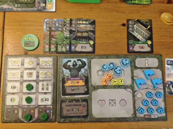 Kann ein Spieler keine der vier Hauptaktionen ausführen, muss er passen. Haben alle Spieler gepasst, folgt die Ruhephase. Spieler nehmen alle ihre Arbeiter zurück und führen alle Produktionseffekte aus. Solche findet man auf unterschiedlichem Spielmaterial wie die Stammes-Anführer-Karte, das zugehörige Plättchen, gespielte Erkundungskarten, das Wissenschafts-Tableau, Distrikt-Scheiben und mehr. Man bekommt also insgesamt einiges an Einkommen. Danach erhalten alle Spieler vier neue Erkundungskarten, je nach Runde in unterschiedlicher Zusammensetzung aus Basis und fortgeschrittenen Karten. Zuletzt wird der Startspielermarker weitergegeben, der Rundenanzeiger vorwärtsbewegt und eine neue Runde beginnt. In der vierten Runde findet keine Ruhephase statt; hier endet das Spiel mit der Endwertung.