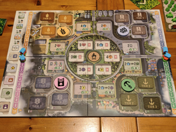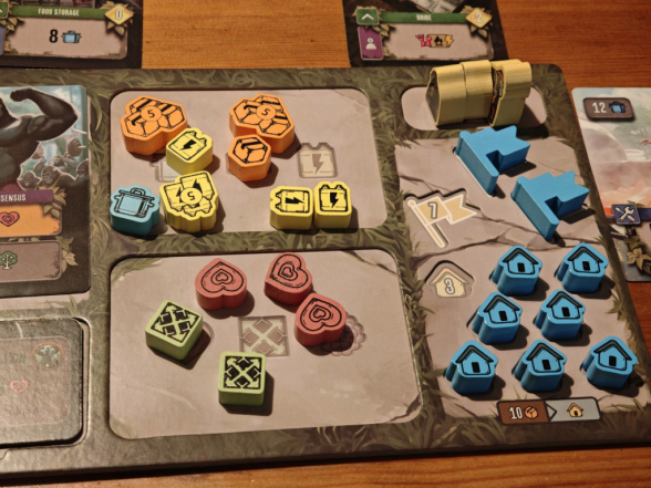 Zuletzt geht es zur Vorbereitung des persönlichen Spielerbereichs. Jeder Spieler nimmt sich ein Spieler-Tableau und das gesamte Holzmaterial in Spielerfarbe. Auf der rechten Seite des Tableaus gibt es Platz für die drei Flaggen und die acht Häuser. Diese können im Spielverlauf auf den Spielplan platziert werden, um Siegpunkte und Boni zu sichern. Die vier Autoritätsmarker in Spielerfarbe kommen auf die vier Autoritätsleisten des Spielplans. Bis hierhin sieht bei den Mitspielern erstmal alles gleich aus.