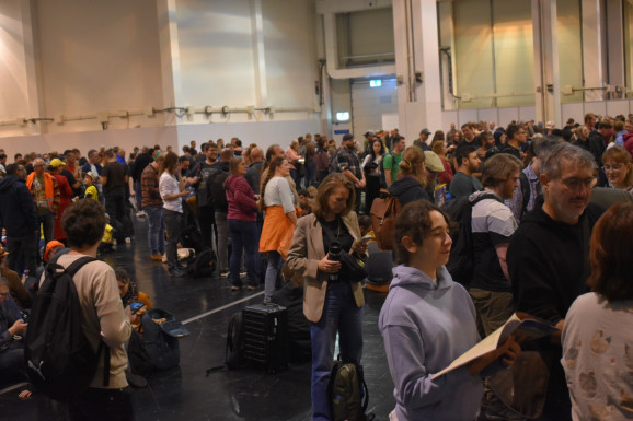 Mittlerweile ist es eine gute Stunde später und wir schlendern in Richtung Halle 3, denn hier steht ein Presseevent an. Wir schnuppern kurz rein, bevor wir in weitere Termine gehen und dabei feststellen: Der Unterschied zwischen Halle 6/7 (Familienspiele) und Halle 3 (Expertenspiele) ist gigantisch. Während man in den ersten Hallen relativ gut laufen kann, muss man in Halle 3 einen auf Lightning McQueen in der Traktorszene machen: Lücke suchen und mit Vollgas drauf zusteuern oder sich in der Masse treiben lassen. Mittlerweile hat sich der erste Eindruck etwas gewandelt: Man realisiert, wie groß die Messe ist und wie viele Leute die angestrebten 220000 Messebesucher*innen in 4 Tagen eigentlich sind. Trotzdem sind wir dazu gekommen noch einige gute Gespräche mit Verlagen zu führen und uns dort Spiele zeigen zu lassen.