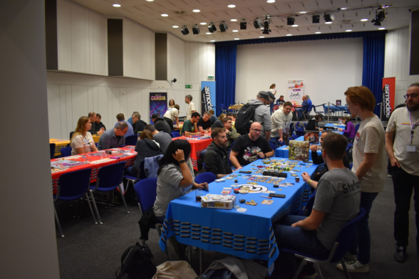 Den Samstag begannen wir wieder am Eingang West und Halle 3, mit Ronin von Queen Games. Da wir um 11:00 einen Termin bei Iongames zu einer Runde Atlas hatten, konnten wir es aber nicht zu Ende spielen. Neben weiteren Terminen folgten noch eine Runde Flip 7 an einem „Black Jack“-Tisch und eine Runde Heat, zu dem uns unser Lieblingspromoter von asmodee angestiftet hatte. Kurz vor Ende schafften wir es dann sogar noch Herr der Ringe - Das Schicksal der Gefährten zu spielen, was bei uns sehr durchwachsen abschnitt. Ob es an der deutsch-englischen Spielgruppe lag oder am Spielprinzip… wir sind uns nicht sicher. Mit fünf Spielen war der Samstag dann auch der Tag, an dem wir die meisten Spiele spielen konnten.