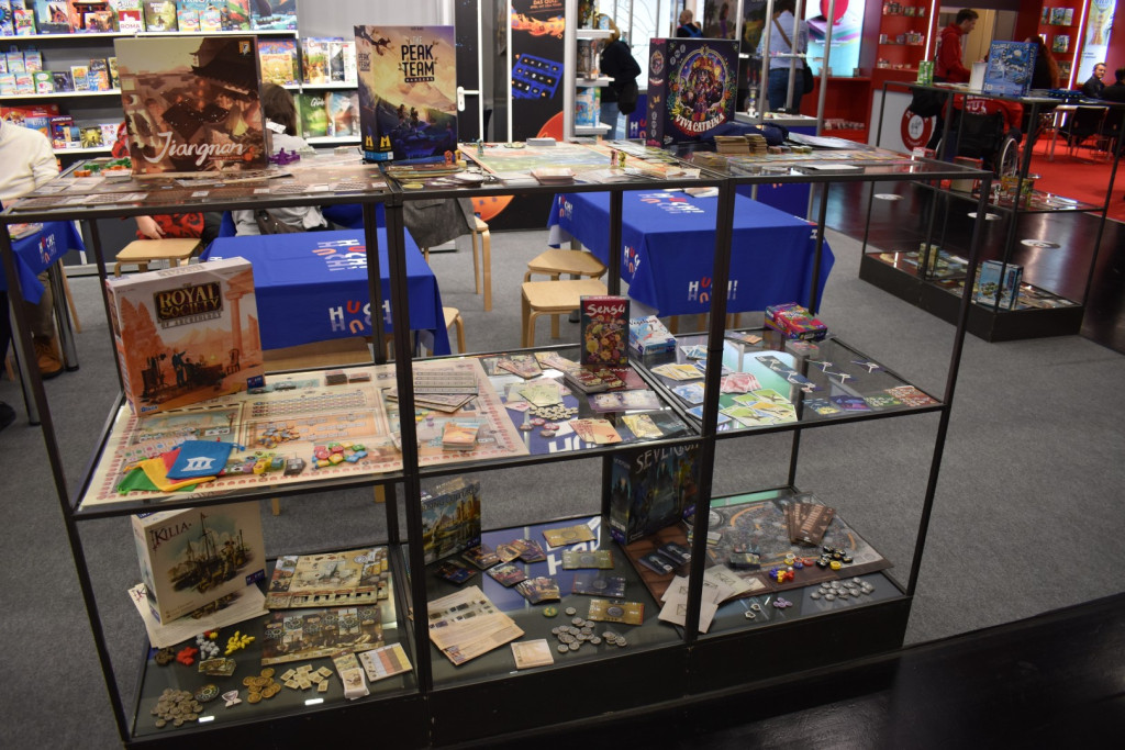 Ebenfalls am Amigo-Stand befand sich der Verlag Peasoup, der zwei „Spielbücher“ herausbringt, die uns gerade mit einem Kind in der Grundschule besonders gelockt haben. In einer Kombination aus klassischem Abenteuerbuch, einer App und Karten sind wir hier sehr gespannt, wie das Spiel bei Kindern ankommt. Dann ging es weiter zu Hutter, die sich nun auch mit um den Vertrieb des „Spiel Das!“-Verlags kümmern. Hier gab es interessante Ausblicke auf Jiangnan, Workerplacement in China, das kooperative Bergsteiger-Spiel The Peak Team und ein paar interessante Logik-Spiele. Von „Spiel Das!“ stach uns vor allem das uns bereits bekannte Aqualuma und Aelos ins Auge. Aber auch Raising Robots und die Vielfalt an Würfel- und 2-Spieler-Spielen weckten unsere Aufmerksamkeit.