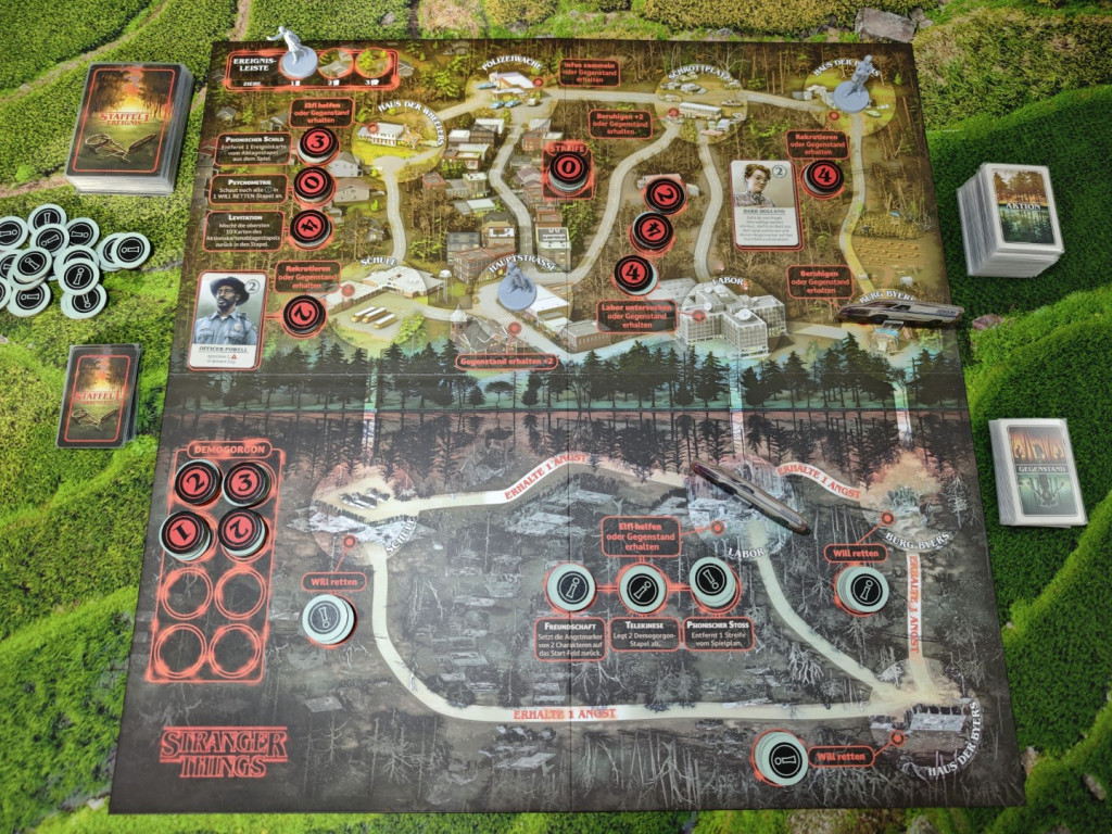 Schauen wir uns nun den Spielaufbau an, und zwar exemplarisch an Staffel 1. Zuerst kommt der Spielplan in die Tischmitte, mit der Seite nach oben, die in der unteren Spielplanhälfte die Schattenwelt zeigt. Der Spielplan für Staffel 2 zeigt stattdessen das Tunnelnetzwerk, während beide Spielpläne im oberen Bereich die Umgebung von Hawkins darstellen. Der Spielplan zeigt verschiedene Orte, die über Straßen verbunden sind. Charaktere bewegen sich im Spielverlauf zwischen den Orten und führen dort meist ortsspezifische Aktionen aus.